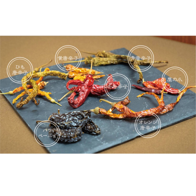 赤唐辛子、ハラペーニョ、青唐辛子、鷹の爪、オレンジ唐辛子、黄唐辛子、ひも唐辛子(すべて秩父産)